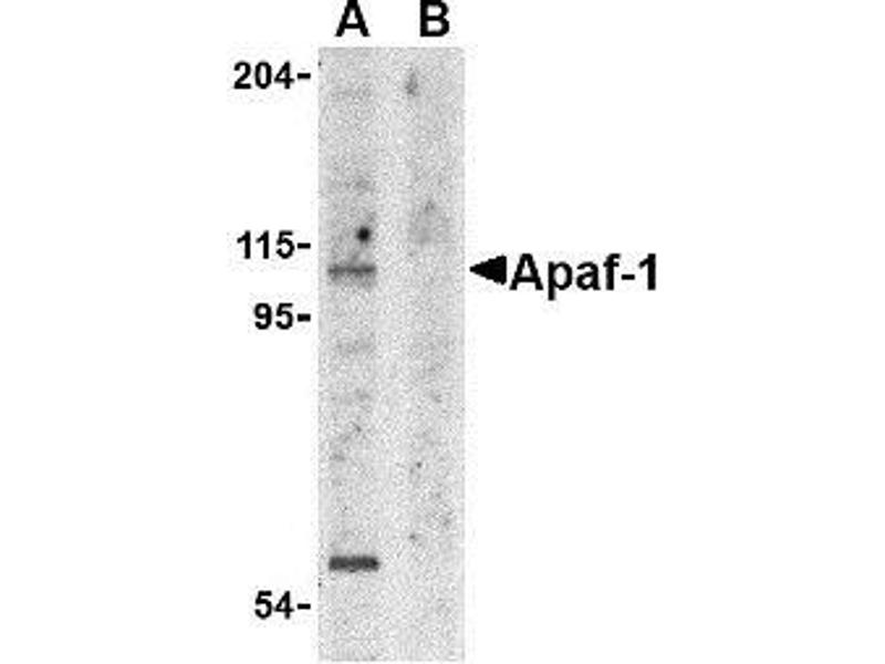 Apaf1 antibody was raised against a peptide corresponding to amino acids near the amino terminus of human Apaf1. The sequences of the immunogenic peptide are identical between human and mouse.