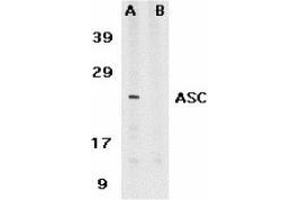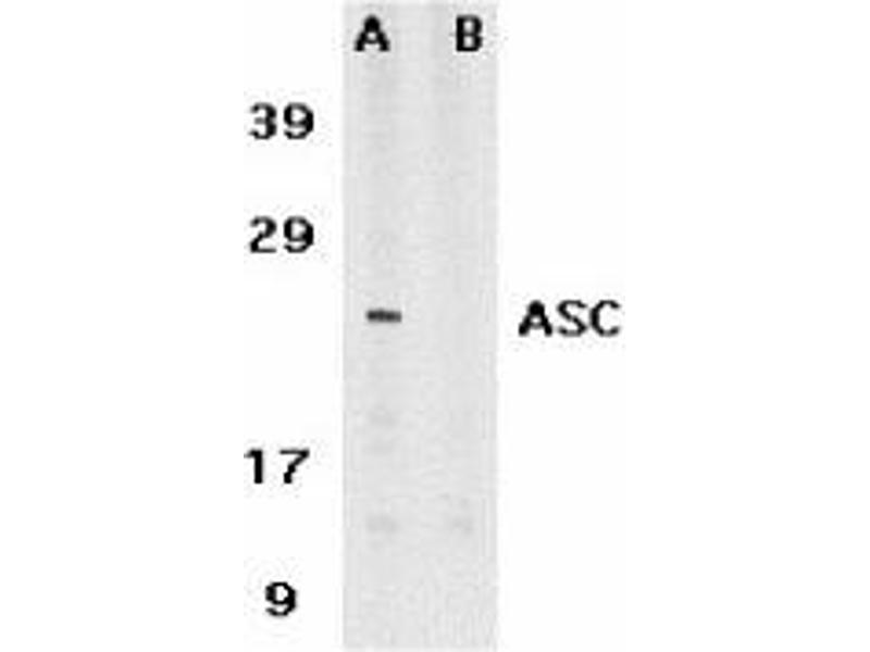 ELISA. Western Blot: ASC antibody can be used for detection of ASC/TMS1 at 1 μg/mL. Anapproximately 25 kDa band can be detected. Immunocytochemistry. Other applications not tested. Optimal dilutions are dependent on conditions and should be determined by the user.