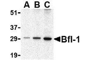 Apoptosis plays a major role in normal organism development, tissue homeostasis, and removal of damaged cells and is caused by caspase activation. Proteins that comprise the Bcl-2 family appear to control the activation of these enzymes. One such member is multi-domain antiapoptotic protein Bfl-1, which is overexpressed in stomach and other cancers. Bfl-1 can interact with Bax and suppress apoptosis by inhibiting the release of cytochrome c and caspase-3 activation. It is upregulated in cisplatin-resistant human bladder tumor, suggesting that its expression may be important for cisplatin resistance and inhibition of apoptosis in cancer cells. At least two isoforms of Bfl-1 are known to exist. Presumably due to post-translational modifications, Bfl-1 is often observed at higher molecular weight in SDS-PAGE than its predicted molecular weight would suggest.Synonyms: BCL2A1, BCL2L5, BFL1, Bcl-2-like protein 5, Bcl-2-related protein A1, GRS, HBPA1, Hemopoietic-specific early response protein, Protein BFL-1