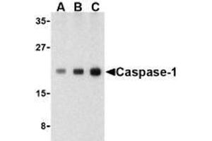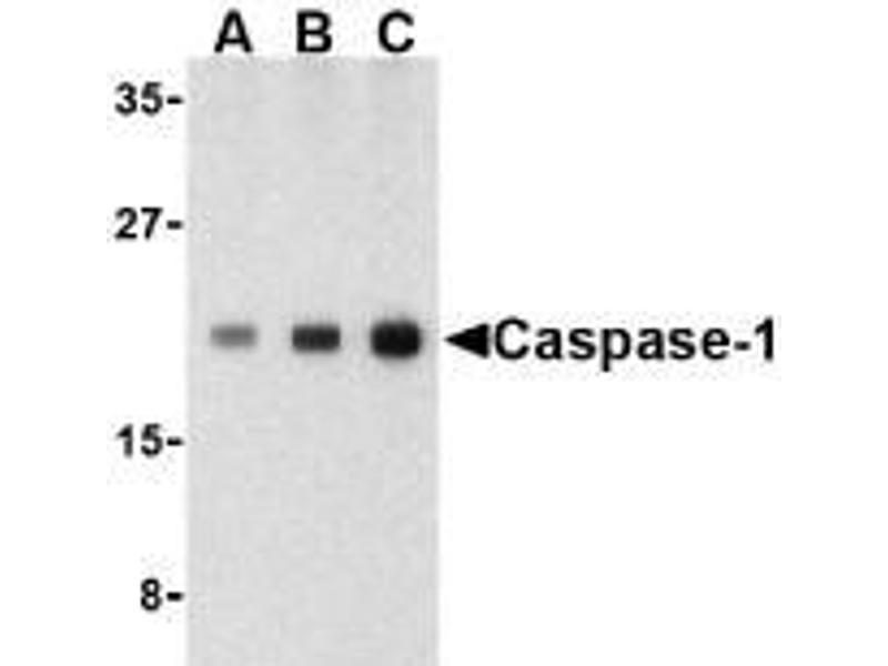 Caspases are a family of cysteine proteases that can be divided into the apoptotic and inflammatory caspase subfamilies. Unlike the apoptotic caspases, members of the inflammatory subfamily are generally not involved in cell death but are associated with the immune response to microbial pathogens (reviewed in 1 and 2). Members of this subfamily include caspase-1, -4, -5, and -12 and can activate proinflammatory cytokines such as IL-1? and IL-18 (3,4). Caspase-1 was initially identified as an IL-1beta-converting enzyme (5), later experiments revealed it to be a mammalian homolog of the C. elegans cell death gene ced-3 (6) whose overexpression can induce apoptosis in fibroblasts (7).Synonyms: CASP-1, CASP1, ICE, IL1BC, IL1BCE, Interleukin-1 beta convertase, Interleukin-1 beta-converting enzyme, p45