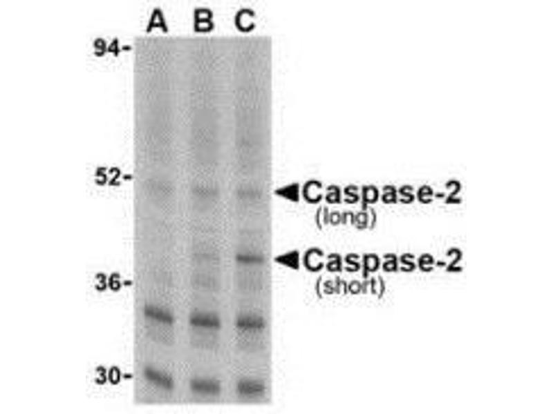 ELISA. Western Blot: Caspase-2 antibody can be used for the detection of caspase-2 at 1 μg/mL. Depending on cell lines or tissues used, other cleavage products may be observed. Immunohistochemistry. Other applications not tested. Optimal dilutions are dependent on conditions and should be determined by the user.