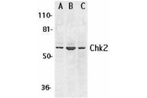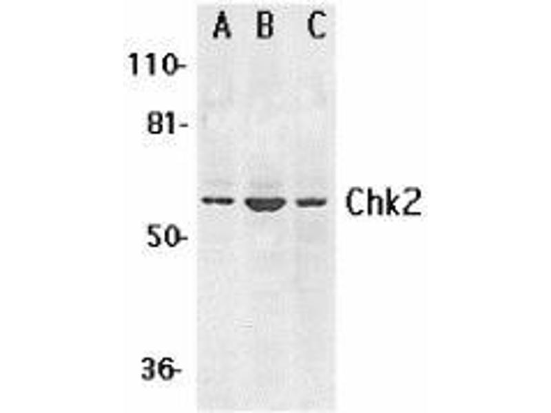ELISA. Western Blot: Chk2 antibody can be used for detection of Chk2 at 0.5 to 1 μg/mL. A 60 kDaband can be detected. Immunocytochemistry. Other applications not tested. Optimal dilutions are dependent on conditions and should be determined by the user.