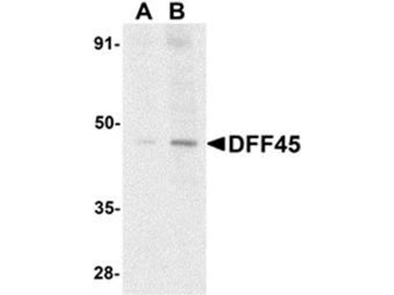 ELISA. Western Blot: DFF45 antibody can be used for detection of DFF45, DFF35, and one thecleaved fragment at 1/1000 to 1/2000 dilution.45 and 35 kDa bands can be detected innon-apoptotic cells.