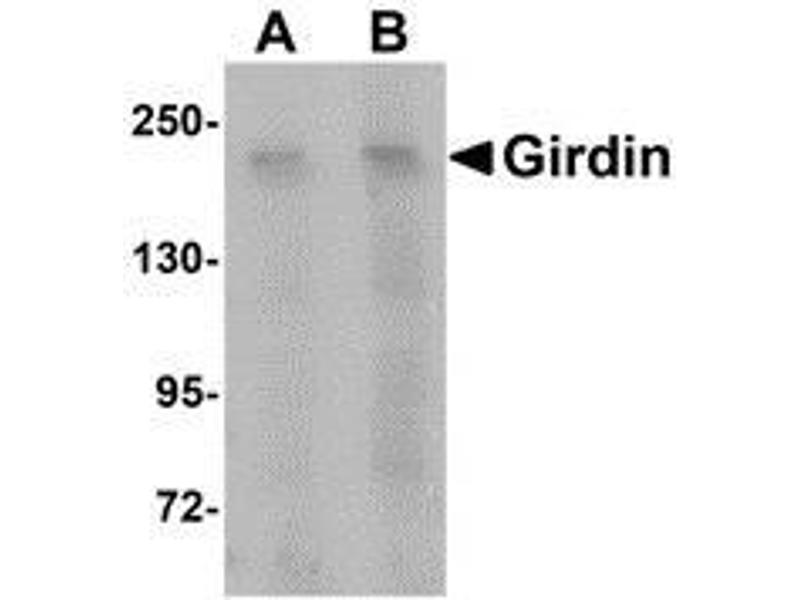 Girdin is a Galpha-interacting protein that can enhance the activation of the protein kinase Akt, remodel the actin cytoskeleton, and is thought to be involved in the regulation of cell migration and cancer metastasis. It has recently been shown that Girdin interacts with Disrupted-in-Schizophrenia 1 (DISC1), a susceptibility gene for major psychiatric disorders. DISC1 is thought to be involved in the migration, positioning and differentiation of dentate granule cells (DGCs) during development, depletion of Girdin or blocking the Girdin-DISC1 interaction results in defects in axonal sprouting in the CA3 region of the hippocampus and overextended migration of mispositioning of DGCs, suggesting the Girdin plays a role in postnatal neurogenesis in the dentate gyrus.Synonyms: APE, Akt phosphorylation enhancer, CCDC88A, Coiled-coil domain-containing protein 88A, G alpha-interacting vesicle-associated protein, GIV, GRDN, Girders of actin filament, HkRP1, Hook-related protein 1, KIAA1212
