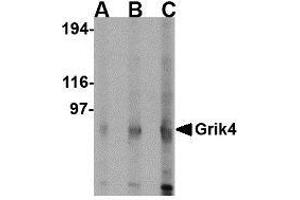 Grik4 codes for the KA1 subunit of kainate-type ionotropic glutamate receptors which are critical regulators of network activity that act by modifying neuronal excitability, directly and indirectly, through GABAergic interneurons. Five subunits can assemble to form kainate receptors (KARs): GluR5 (coded by Grik1), GluR6 (coded by Grik2), and GluR7 (coded by Grik3) are the low-affinity subunits, and KA1 and KA2 are the high-affinity subunits. In the adult brain, KARs are located pre- and postsynaptically on pyramidal cells and on interneurons. Kainate receptors on GABA-containing interneurons enhance GABA release and thereby downregulate glutamatergic signaling. KARs have been implicated in numerous psychiatric disorders. Case control studies show significant association of Grik4 with both schizophrenia and bipolar disorder. Despite its predicted molecular weight, Grik4 often migrates at a lower molecular weight in SDS-PAGE.Synonyms: EAA1, Excitatory amino acid receptor 1, Glutamate receptor ionotropic kainate 4