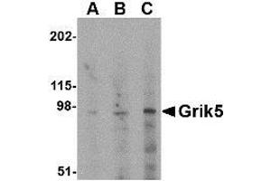 Glutamate receptors are the predominant excitatory neurotransmitter receptors in the mammalian brain and are activated in a variety of normal neurophysiologic processes. Grik5, also known as kainate-preferring glutamate recptor subunit KA2, belongs to the kainate family of glutamate receptors, which are composed of four subunits and function as ligand-activated ion channels. Grik5 is highly homologous to the related ionotrophic glutamate receptor Grik4 (also known as KA1). Like Grik4, Grik5 does not form homomeric channels, but instead forms heteromers with Grik2. In Grik2- but not Grik1-null mice, Grik5 surface expression is greatly reduced in neurons, indicating that Grik2/Grik5 heteromers are required for exit from the endoplasmic reticulum to the cell surface. This Grik5 antibody does not cross-react with Grik4.Synonyms: EAA2, Excitatory amino acid receptor 2, Glutamate receptor ionotropic kainate 5