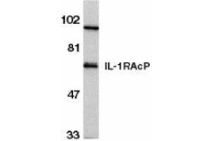 IL-1RAcP antibody was raised against a peptide corresponding to amino acids near the carboxy terminus of IL-1RAcP, which differs from the sequence of mouse origin by three amino acids. It has no cross activity to other member in the IL-1 receptor family.