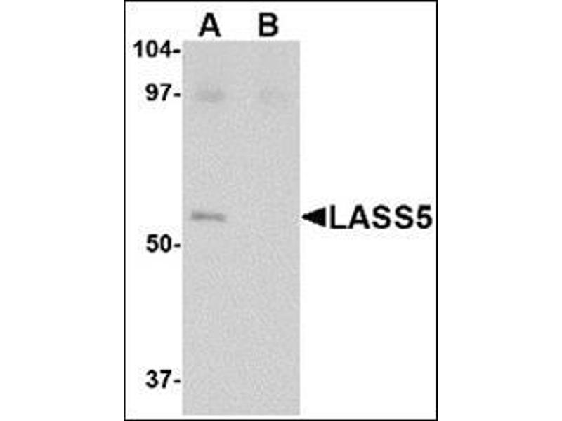 The LASS (longevity assurance homolog) family members represent a subgroup of the homeobox gene family and are highly conserved from yeasts to mammals. Six members of this family of proteins have been characterized (LASS1-6) and all are involved in ceramide synthesis during cell growth regulation and cancer differentiation. LASS5, also called Trh4, is a 392 amino acid endoplasmic reticulum, multi-pass membrane protein. Functioning as a dihydro-ceramide synthase, LASS5 is involved in the production of sphingolipids containing mainly one fatty acid donor (N-linked palmitoyl-ceramide) in a fumonisin B1-independent manner. It uses palmitoyl-CoA as an acyl donor and is involved in the synthesis of C14, C16 and C18-ceramide. LASS5 is the most abundantly expressed and predominant ceramide synthase isoform in lung epithelia. Recent studies show that LASS5 partially correct growth and apoptosis. Multiple isoforms of LASS5 are known to exist.Synonyms: LAG1 longevity assurance homolog 5, LASS5, TRAM homolog 4, TRH4, Translocating chain-associating membrane protein homolog 4