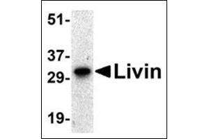 ELISA. Western blot: 2 to 4 μg/mL. Human Raji cell lysate can be used as a positive control and aband at 33 kDa can be detected. A lower but much weaker band at 30 kDa was detected inRaji cell lysate, which may represent the short form of Livin. Immunohistochemistry on paraffin sections. Other applications not tested. Optimal dilutions are dependent on conditions and should be determined by the user.