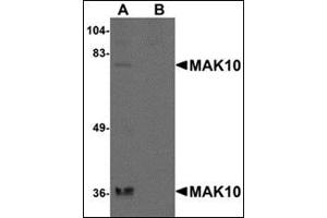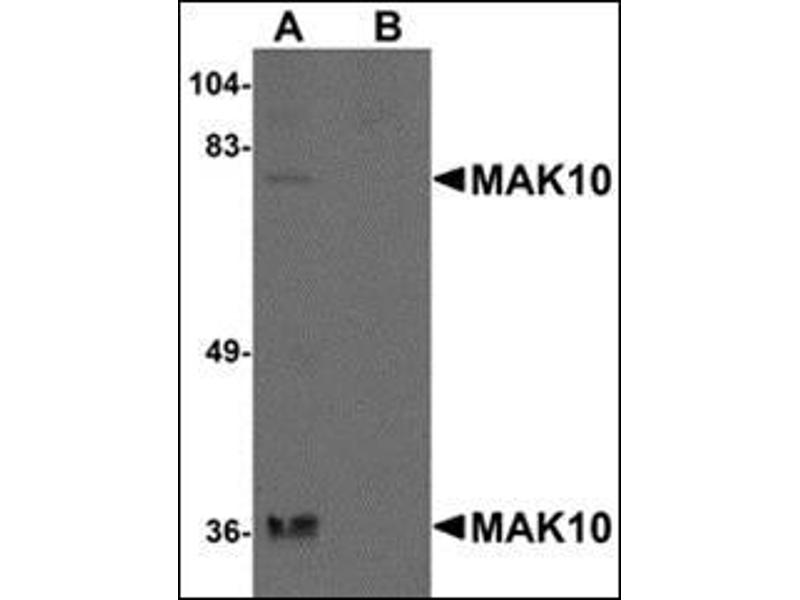 The MAK10 gene encodes a 733-amino acid protein with several regions of similarity to T cell receptor alpha-subunit V (variable) regions in yeast. The mammalian homologue of yeast MAK10, also known as EGAP, is one subunit of a novel N-terminal acetyltransferase (NAT) that is highly conserved among vertebrate species. It is expressed in a variety of tissues in the developing rat embryo but restricted in expression in the adult, remaining detectable only in tissues undergoing continual cell renewal or in cells responding to pathological injury. The MAK10-NAT complex is an essential regulatory enzyme controlling the function of a subset of proteins required for embryonic growth control and vessel development. This complex functionally co-assembles in mammalian cells to regulate cell proliferation and is essential for embryonic development, at least in part through the regulation of target of rapamycin (TOR) signaling events. At least two isoforms of MAK10 are known to exist.Synonyms: EGAP, Embryonic growth-associated protein homolog, N-alpha-acetyltransferase 35 NatC auxiliary subunit