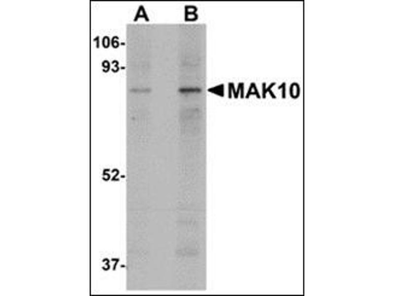The MAK10 gene encodes a 733-amino acid protein with several regions of similarity to T cell receptor alpha-subunit V (variable) regions in yeast. The mammalian homologue of yeast MAK10, also known as EGAP, is one subunit of a novel N-terminal acetyltransferase (NAT) that is highly conserved among vertebrate species. It is expressed in a variety of tissues in the developing rat embryo but restricted in expression in the adult, remaining detectable only in tissues undergoing continual cell renewal or in cells responding to pathological injury. The MAK10-NAT complex is an essential regulatory enzyme controlling the function of a subset of proteins required for embryonic growth control and vessel development. This complex functionally co-assembles in mammalian cells to regulate cell proliferation and is essential for embryonic development, at least in part through the regulation of target of rapamycin (TOR) signaling events. At least two isoforms of MAK10 are known to exist.Synonyms: EGAP, Embryonic growth-associated protein homolog, N-alpha-acetyltransferase 35 NatC auxiliary subunit
