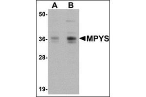 MPYS (TMEM173 / STING) is a recently identified plasma membrane tetraspanner that is associated with major histocompatibility complex class II (MHC-II) and mediates its transduction of apoptotic signals. It has also been found to be associated with VISA, a mitochondrial protein that acts as an adaptor in virus-triggered signaling. MPYS also interacts with IRF3 and recruits the kinase TBK1 to the VISA-associated complex, acting as a critical mediator of virus-triggered IRF3 activation and interferon (IFN) expression. It is thought that the binding of nucleic acid to the innate immune protein RIG-I causes complex formation between RIG-I, VISA, and MPYS. This complex then recruits TBK1 to phosphorylate IRF3 which then directly activates IFN transcription. At least three isoforms of MPYS are known to exist.Synonyms: MITA, Mediator of IRF3 activation, Stimulator of interferon genes protein, Transmembrane protein 173