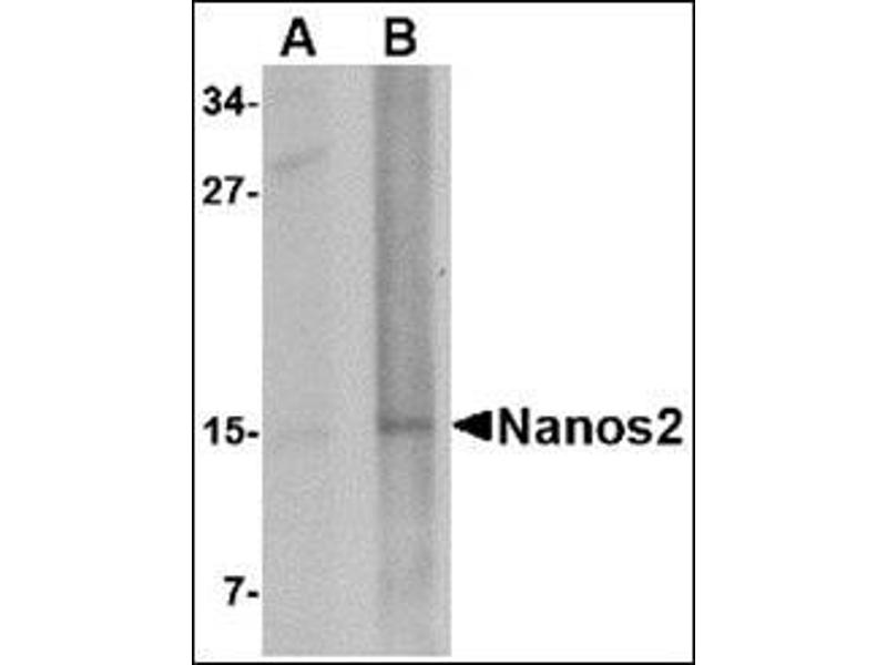 Nanos is a zinc-finger containing, RNA-binding protein that has been implicated in germ cell development in both invertebrates and vertebrates. In drosophila, Nanos represses apoptosis during development to ensure proper germ-line development. Unlike Nanos1 whose expression in mice is dispensable, the Nanos2 and Nanos3 proteins are required for germ cell development. Nanos2-null primordial germ cells (PGCs) die only in the male gonads and show no defects in females, while Nanos3-null PGCs are lost during the migration stage regardless of sex. Nanos2 and Nanos3 have distinct expression patterns during embryo development, suggesting that these two proteins do not have redundant functions. However, expression of Nanos2 can at least partially replace Nanos3 function in a Nanos3-null background. Nanos3 expression can not rescue Nanos2-null defects.Synonyms: NOS2, Nanos homolog 2
