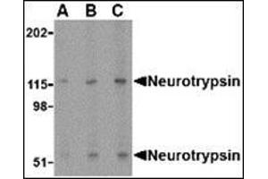 Neurotrypsin is a central nervous system-expressed serine protease whose truncation or absence causes nonsyndromic mental retardation. It is most prominently expressed in structures that are involved in the processing and storage of learned behavior and memory, such as the cerebral cortex, the hippocampus, and amygdala. Evidence suggests that neurotrypsin has multiple functions, including axonal outgrowth, maintaining neuronal plasticity, and arranging the perineuronal environment, partly in coordination with other proteases including tissue plasminogen activator. At least two isoforms of neurotrypsin are known to exist.Synonyms: Leydin, Motopsin, PRSS12, Serine protease 12