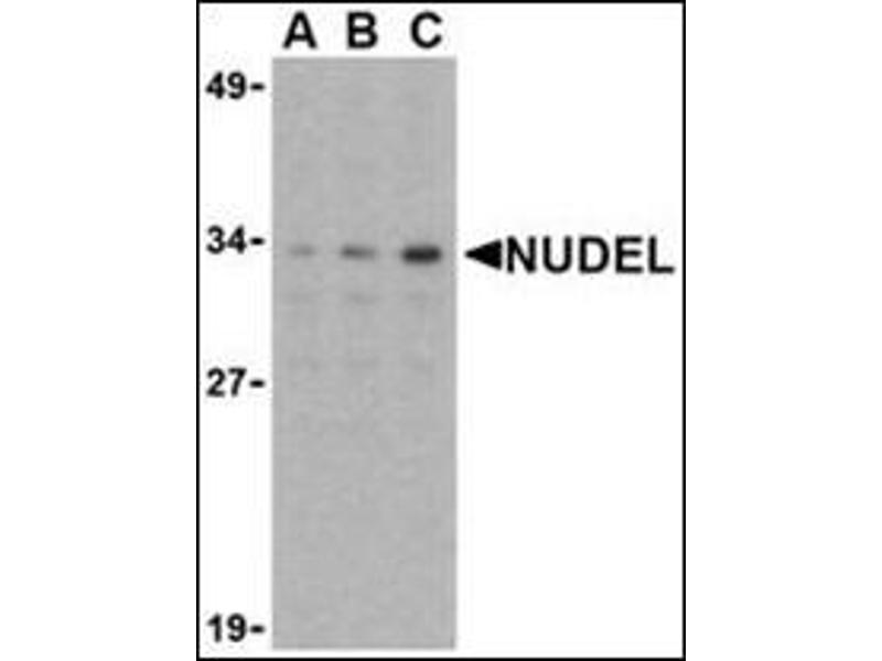 Nudel was initially discovered as a protein homologous to Aspergillus NUDE and that associated with Lis1 and polyprotein complex cytoplasmic dynein, both of which have been linked to neuronal development and migration (1,2). It was later shown to be a substrate of cdk5, a kinase known to be critical during neuronal migration, phosphorylation of Nudel by cdk5 affects its localization in neurons and affects neuritic morphology (1,3). It is thought that together with Lis1, Nudel regulates cytoplasmic dynein, a large polyprotein complex, in neuronal migration and mitosis through direct interactions (4). Similar interactions are thought to also play a role in membrane traffic in other cells as disruption of Nudel expression through RNA interference perturbed normal endomembrane flux and resulted in the fragmentation of the Golgi apparatus (3).Synonyms: EOPA, MITAP1, NUDEL, Nuclear distribution protein nudE-like 1