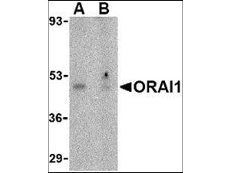 Antigen stimulation of immune cells triggers Ca++ entry through Ca++ release-activated Ca++ (CRAC) channels. ORAI1 is a recently identified four-transmembrane spanning protein that is an essential component of CRAC. A missense mutation in this protein in humans is the cause of one form of hereditary severe combined immune deficiency (SCID) which results in ablated T-cell Ca++ entry. It has been suggested that ORAI1 functions as a highly selective Ca++ plasma membrane channel that is gated through interactions with STIM1, the store-activated endoplasmic reticulum Ca++ sensor. ORAI1 often migrates at a higher than expected molecular weight in SDS-PAGE.Synonyms: CRACM1, Calcium release-activated calcium channel protein 1, ORAI-1, Protein orai-1, TMEM142A, Transmembrane protein 142A