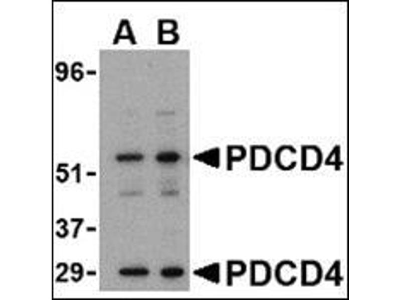 Apoptosis, also known as programmed cell death, plays major roles in development and normal tissue turnover in addition to tumor formation. During this process, the expression patterns of numerous genes are radically altered. One such gene is the programmed cell death protein 4 (PDCD4), whose expression was found to be upregulated in all cell lines following the onset of apoptosis. PDCD4 encodes a tumor suppressor protein whose expression is lost in carcinomas of breast, colon, lung and prostate. It can bind to and inhibit the helicase activity of the eukaryotic translation initiation factor 4A (4) and inhibit the transactivation and transformation mediated by the transcription factor AP-1. The kinase Akt regulates PDCD4 by phosphorylation, decreasing the ability of PDCD4 to interfere with the transactivation of AP-1-responsive promoter by c-Jun. There are two known isoforms of PDCD4.Synonyms: H731, Neoplastic transformation inhibitor protein, Nuclear antigen H731-like, Programmed cell death protein 4