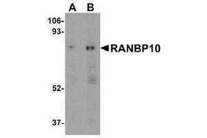 The RAN binding protein 10 (RANBP10) is a cytoplasmic guanine nucleotide exchange factor that shares high sequence similarity to the MET-interacting protein RANBP9. RANBP10 is expressed in the cytoplasm of mature megakaryocytes (MKs) and platelets where it localizes to polymerized noncentrosomal microtubules. RANBP10 possesses guanine nucleotide exchange factor activity towards RAN, a GTPase involved in nucleocytoplasmic traffic, spindle formation at mitosis, and nuclear envelope assembly during telophase, suggesting that RANBP10 may also be involved in these activities. RANBP10 depletion in vitro caused the disturbance of polymerized filaments in MKs and platelets in RANBP10-null mice exhibited disorders in microtubule filament numbers and localization, indicating that RANBP10 may play a significant role in maintaining microtubule dynamics.Synonyms: KIAA1464, Ran-binding protein 10