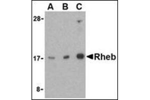 - Rheb antibody was raised against a 15 amino acid peptide from the middle region of human Rheb.