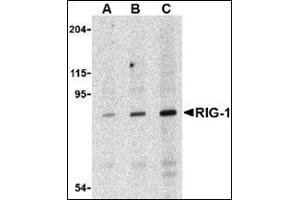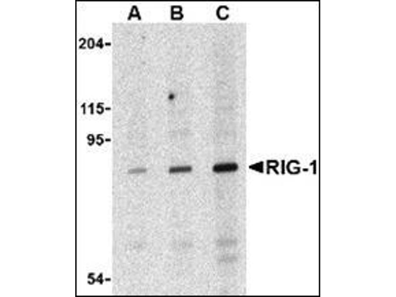 The innate immune system detects viral infection by recognizing various viral components and triggers antiviral responses. Like the toll-like receptor 3 (TLR3), the cytoplasmic helicase retinoic acid inducible gene protein 1 (RIG-1) recognizes double-stranded (ds) RNA, a molecular pattern associated with viral infection. Unlike TLR3 however, RIG-1 activates the kinases TBK1 and IKKepsilon through the adaptor protein IPS-1. These kinases then phosphorylate the transcription factors IRF-3 and IRF-7 which are essential for the expression of type-I interferons. RIG-1 is required for the production of interferons in response to RNA viruses including paramyxoviruses, influenza virus, and Japanese encephalitis virus.Synonyms: DEAD box protein 58, DKFZp434J1111, DKFZp686N19181, FLJ13599, Probable ATP-dependent RNA helicase DDX58, RIG-1, RIG-I, Retinoic acid-inducible gene 1 protein