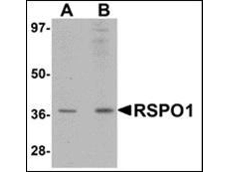 RSPO1 is a member of a family of secreted growth factors that can operate through the canonical Wnt signaling pathway by stabilizing the intracellular b-catenin, thereby regulating functions mediated by b-catenin such as cell fate decisions and embryonic patterning. RSPO1 was recently identified through linkage analysis to be involved in sex determination and mammalian ovarian development. RSPO1 is thought to regulate cellular responsiveness to Wnt ligands by modulating the cell-surface expression of the Wnt co-receptor LRP6 by interfering with the DKK/Kremen-mediated internalization of LRP6 through an interaction with Kremen, resulting in increased LRP6 cell-surface levels. At least two isoforms of RSPO1 are known to exist.Synonyms: R-spondin-1, Roof plate-specific spondin-1