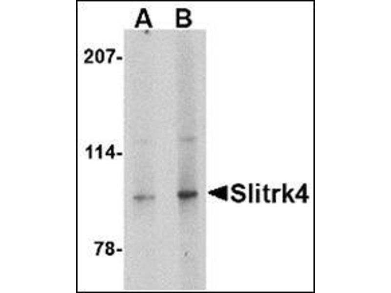 This antibody detects SLITRK4 at C-term. It is predicted to have no cross-reactivity to other Slitrk proteins.