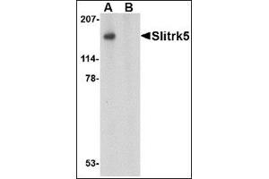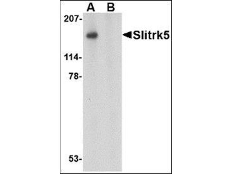 SLIT and NTRK-like family 5 (Slitrk5) is a member a protein family consisting of six homologous transmembrane proteins (Slitrk1-6) that share two conserved leucine-rich repeat domains in the extracellular domain and have significant homology to Slit, a secreted axonal growth-controlling protein. These proteins are also homologous to trk neurotrophin receptors in their intracellular domains. Expression of Slitrk proteins is highly restricted to neural and brain tumor tissues, but varies within the protein family. Like every other Slitrk protein except Slitrk1, overexpression of Slitrk5 inhibited neurite outgrowth in cultured neurons, suggesting that these proteins are involved in the control of neurite outgrowth.Synonyms: KIAA0918, LRRC11, Leucine-rich repeat-containing protein 11, SLIT and NTRK-like protein 5