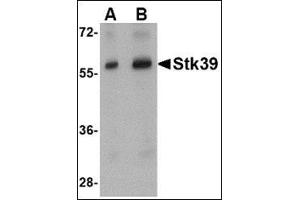 The serine/threonine kinase Stk39 belongs to the STE20 family, a group of kinases that are known to interact with inflammation-related kinases (such as p38, JNK, NKCC1, PKC-theta, WNK and MLCK), and with transcription factor AP-1. The STE 20 family is involved in diverse biological phenomena, including cell differentiation, cell transformation/ proliferation, cytoskeleton rearrangement, and the regulation of ion transporters. STK39 contains an N-terminal series of proline and alanine repeats (PAPA box), followed by a serine/threonine kinase catalytic domain and is abundantly expressed in the brain. STK39 is activated in response to hypotonic stress, leading to phosphorylation of several cation-chloride-coupled co-transporters. The catalytically active kinase specifically activates the p38 MAP kinase pathway, and its interaction with p38 decreases upon cellular stress, suggesting that this kinase may serve as an intermediate in the response to cellular stress. Recent studies show that STK39 tend to be a novel candidate gene for autism and hypertension.Synonyms: DCHT, STE20/SPS1-related proline-alanine-rich protein kinase, Serine/threonine-protein kinase 39, Ste-20-related kinase