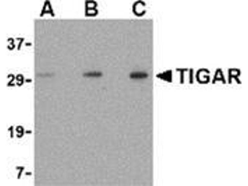 The p53 tumor-suppressor gene integrates numerous signals that control cell life and death, loss of its functions contributes to the development of most cancers. Recent studies have demonstrated the ability of p53 to regulate the expression of several proteins involved in glycolysis and oxidative phosphorylation, such as TIGAR, SCO2, and phosphoglycerate mutase. TIGAR is a recently discovered protein that functions to regulate glycolysis and protect cells against oxidative stress. TIGAR is similar in structure to proteins in the phosphoglycerate mutase family, most notably 6-phosphofructo-2-kinase, suggesting TIGAR may function as a fructose bisphosphatase. Expression of TIGAR in transfected cells correlated with an inhibition of glycolysis and decreased levels of reactive oxygen species and p53-induced apoptosis, indicating that TIGAR may act to modulate the apoptotic response to p53, thereby allowing cells to survive mild or transient stresses.Synonyms: 6-bisphosphatase TIGAR, C12orf5, Probable fructose-2, TP53-induced glycolysis and apoptosis regulator