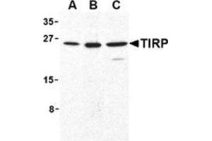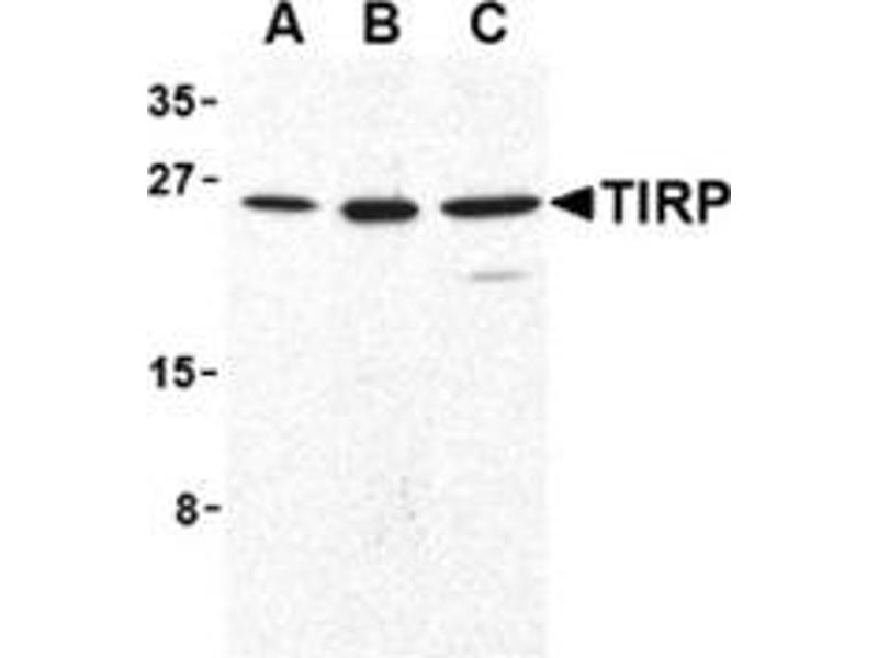 TIRP is a member of the Toll/interleukin-1 receptor (TIR) family, a group of proteins that include the Toll-like receptors (TLRs) (1-3). TLRs are signaling molecules that recognize different pathogen-associated molecular patterns (PAMPs) and serve as an important link between the innate and adaptive immune responses (4). TIRP, along with other molecules such as TRIF, MAL, and MyD88, serves as an adaptor protein that allows for the interaction and activation of the IL-1R-associated kinase (IRAK) family, the subsequent activation of TNF receptor associated factor (TRAF)-6, and ultimately the activation of NF-kappaB (5). Expression of TIRP appears to be essential for TLR4 signalling (6).Synonyms: Putative NF-kappa-B-activating protein 502, TICAM-2, TIR domain-containing adapter molecule 2, TIRAP3, TIRP, TRIF-related adapter molecule, Toll-like receptor adaptor protein 3, Toll/interleukin-1 receptor domain-containing protein