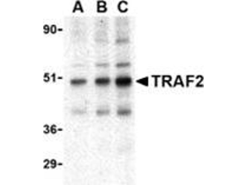 Tumor necrosis factor (TNF) receptor associated factors (TRAFs) were initially discovered as adaptor proteins that link the TNF receptor superfamily to signaling pathways and are thus important regulators of cell death and cellular response to stress (1). TRAF proteins share a homology region that allows them to bind to cell receptors and other TRAF proteins, causing the activation of different signal cascades depending on the TRAFs involved. For example, TRAF2 and TRAF3 directly bind to the CD40, a TNF receptor superfamily member involved in inducing B cell immunity (2), and are critical for NF-kappaB activation in mouse B lymphocytes (3). TRAF2 along with TRAF6 has also been shown to be required for CD40 signaling in nonhemopoietic cells (4). TRAF2 also interacts with the TRFR superfamily member lymphotoxin-b receptor (LTbR) in association with TRAF3 and the apoptosis inhibitors cIAP1 and Smac (5).Synonyms: TNF receptor-associated factor 2, Tumor necrosis factor type 2 receptor-associated protein 3