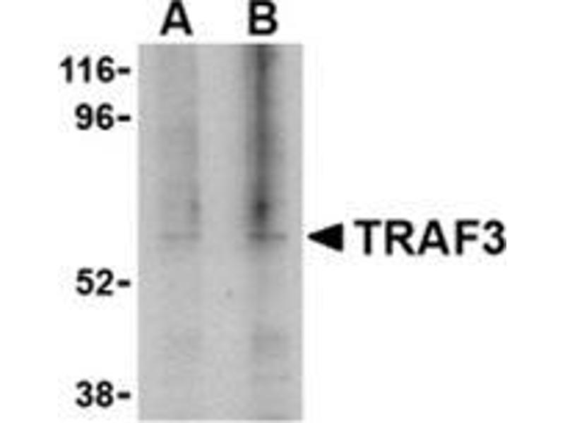 Tumor necrosis factor (TNF) receptor associated factors (TRAFs) are the major signal transducers for the TNF receptor superfamily and the interleukin-1 receptor/Toll-like receptor (IL-1/TLR) superfamily (1). TRAF3 was first identified by its interaction with CD40 and the Epstein-Barr virus transforming protein LMP1 (2,3). Several TRAF3 mRNA splice variants exist and some of these can activate the transcription factor NF-kappaB (4). Besides CD40, TRAF3 also interacts with the TRFR superfamily member lymphotoxin-beta receptor (LTbetaR) in association with TRAF2 and the apoptosis inhibitors cIAP1 and Smac. It has been suggested that TRAF3 induces mitochondria-mediated apoptosis upon binding of the TNF family cytokine LIGHT by LTbetaR (5).Synonyms: CAP-1, CAP1, CD40 receptor-associated factor 1, CD40-binding protein, CD40BP, LAP1, LMP1-associated protein, TNF receptor-associated factor 3