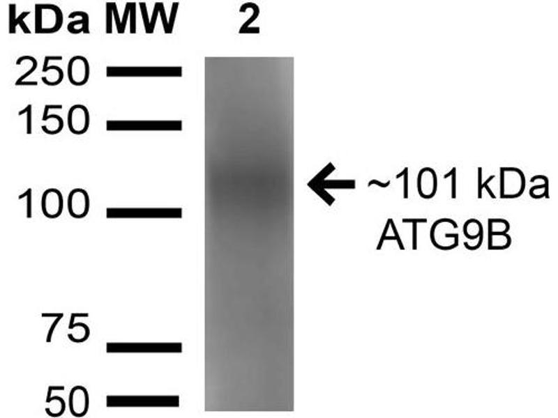 A 1:1000 dilution of ABIN5066221 was sufficient for detection of ATG9B in 15 μg of Human HeLa Cell Lysates by ECL immunoblot analysis using goat anti-rabbit IgG:HRP as the secondary antibody.