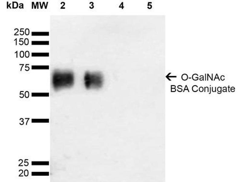 A 1:1000 dilution of ABIN5067146 was sufficient for detection of O-GlcNAc in 2 μg of O-GlcNAc conjugated to BSA by ECL immunoblot analysis using Goat Anti-Mouse IgG:HRP as the secondary Antibody.