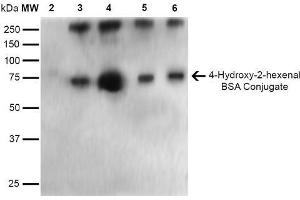 A 1:1000 dilution of ABIN5067275 was sufficient for detection of 4-Hydroxy-2-hexenal in 0.5 μg of 4-Hydroxy-2-hexenal conjugated to BSA and 4-Hydroxy nonenal conjugated to BSA by ECL immunoblot analysis using Goat Anti-Mouse IgG:HRP as the secondary Antibody.
