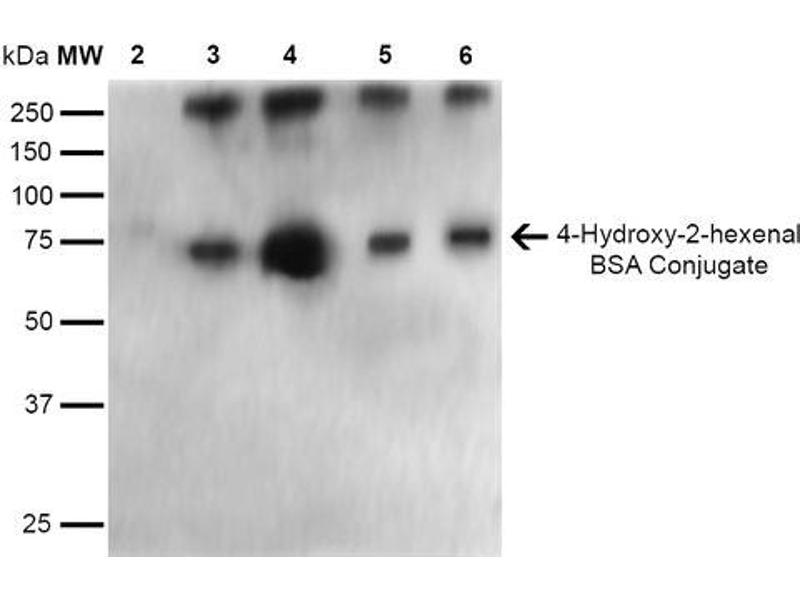 A 1:1000 dilution of ABIN5067281 was sufficient for detection of 4-Hydroxy-2-hexenal in 0.5 μg of 4-Hydroxy-2-hexenal conjugated to BSA and 4-Hydroxy nonenal conjugated to BSA by ECL immunoblot analysis using Goat Anti-Mouse IgG:HRP as the secondary Antibody.