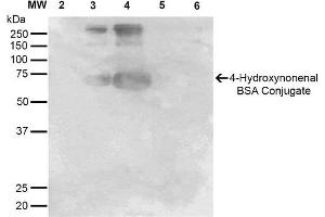 A 1:1000 dilution of ABIN5067305 was sufficient for detection of 4-Hydroxynonenal in 0.5 μg of 4-Hydroxynonenal conjugated to BSA by ECL immunoblot analysis using Goat Anti-Mouse IgG:HRP as the secondary Antibody.