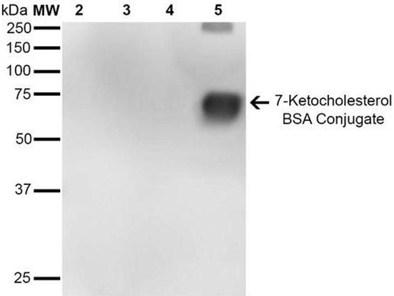 A 1:1000 dilution of ABIN5067319 was sufficient for detection of 7-Ketocholesterol in 2 μg of 7-ketocholesterol conjugated to BSA by ECL immunoblot analysis using Goat Anti-Mouse IgG:HRP as the secondary Antibody.