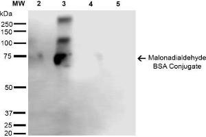 A 1:1000 dilution of ABIN5067347 was sufficient for detection of Malondialdehyde in 2 μg of Malondialdehyde conjugated to BSA by ECL immunoblot analysis using Goat Anti-Mouse IgG:HRP as the secondary Antibody.