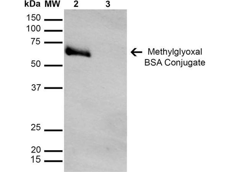 Specific for Methylglyoxal modified proteins. Does not detect free Methylglyoxal. Does not cross-react with Acrolein, Hexanoyl Lysine, MDA, 4-HHE, 4-HNE, or Crotonaldehyde modified proteins.