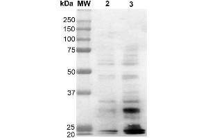 A 1:1000 dilution of ABIN5067482 was sufficient for detection of dityrosine in 1 μg of Dityrosine conjugated to BSA by ECL immunoblot analysis using Goat Anti-Mouse IgG:HRP as the secondary Antibody.