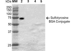 A 1:1000 dilution of ABIN5067499 was sufficient for detection of Sulfotyrosine in 0.5 μg of Sulfotyrosine conjugated to BSA by ECL immunoblot analysis using Goat Anti-Mouse IgG:HRP as the secondary Antibody.
