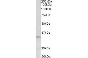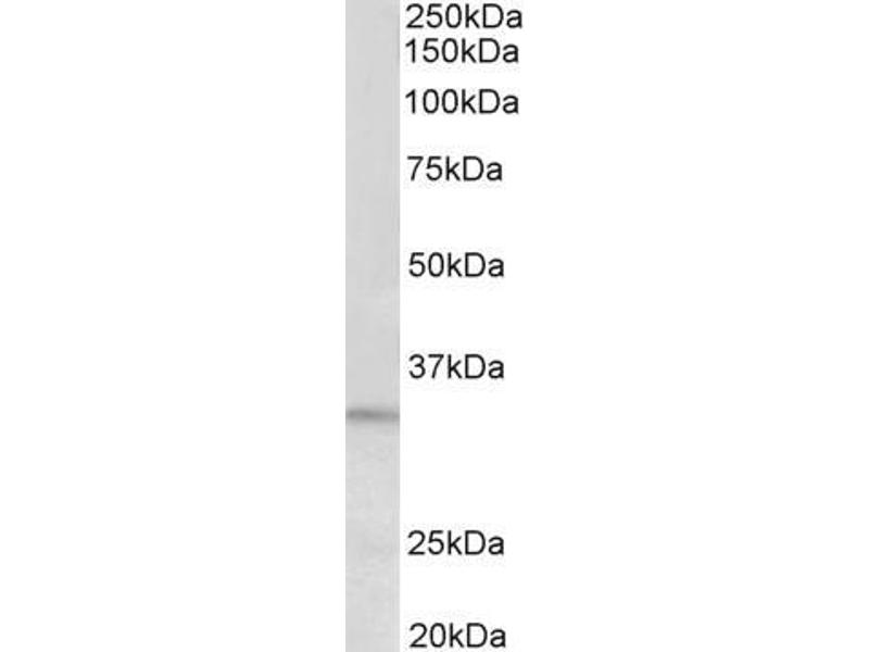 Western Blot: Approx 33 kDa band observed in lysates of cell line HeLa (calculated MW of 29.1 kDa according to NP_056970.1). Recommended concentration: 0.3-1 μg/mL. Preliminary testing was unsuccessful on Mouse and Rat Brain for this particular batch.