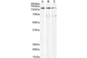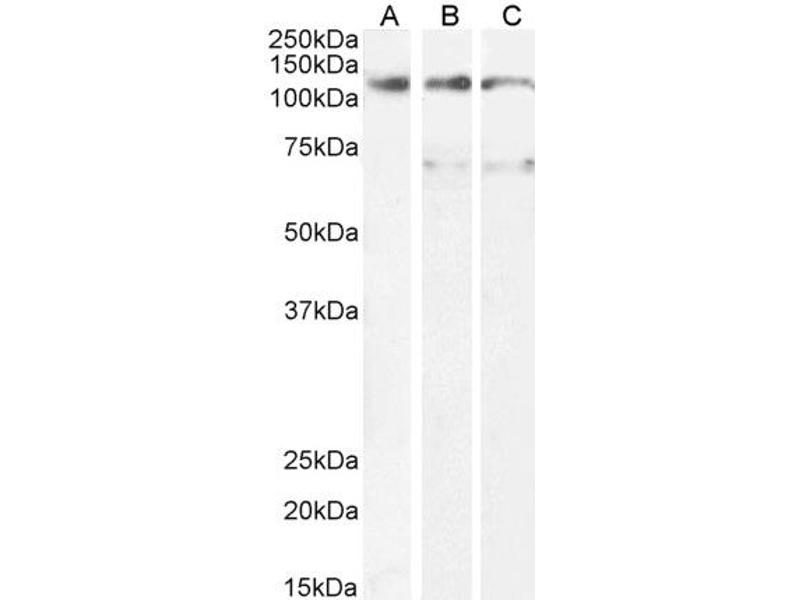 Western Blot: Approx 125 kDa band observed in lysates of cell line U937 and approx 70+125 kDa in lysates of cell line A431 and HepG2 (calculated MW of 111 kDa according to NP_003990.1 (isoform 1) and NP_001310435.1 (isoform 3), and 66.0 kDa according to NP_