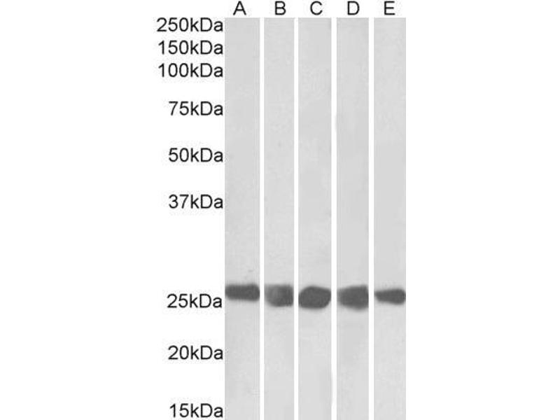 Western Blot: Approx 26 kDa band observed in lysates of cell lines NIH3T3, HeLa, K562, MCF7 and HepG2, and in Pig Testis lysates (calculated MW of 24.9 kDa according to Human, NP_001311.3, Mouse NP_034105.1 and Pig NP_001138849.1 ). Recommended concentrati