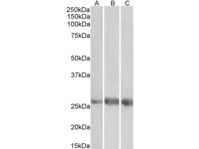 Western Blot: Approx 26-27 kDa band observed in Human Heart, Kidney and Lung lysates (calculated MW of 29.6 kDa according to NP_057299.1). The observed molecular weight corresponds to the mature form (calc. MW 27.1 kDa without its 23aa signal peptide). Reco