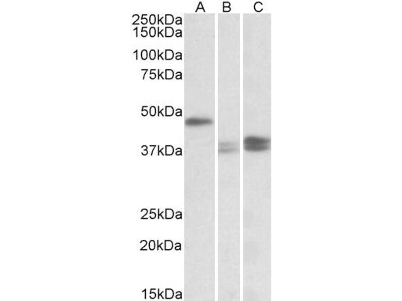 Western Blot: Approx 50+38 kDa bands observed in Human Lymph Nodes lysates (calculated MW of 47.6 kDa according to NP_110437.2 and of 36.2 kDa according to NP_001139021.1). A 48 kDa band was observed in Mouse Lymph Node while a 37-38 kDa doublet was observed