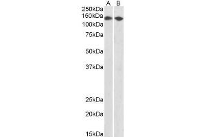 Western Blot: Approx 140 kDa band observed in nuclear lysates of cell lines HEK293, MCF7 and NIH3T3 (calculated MW of 103 kDa according to Human NP_066997.3 and Mouse NP_666167.3). The observed molecular weight is explained by its acetylation (Zheng et al