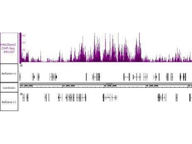 - AbFlex™ Histone H4K20me3 antibody was expressed as full-length IgG with mouse immunoglobulin heavy and light chains (IgG2a isotype) in mammalian 293 cells. Histone H4 is one of the core components of the nucleosome. The nucleosome is the smallest subunit of chromatin and consists of 147 base pairs of DNA wrapped around an octamer of core histone proteins (two each of Histone H2A, Histone H2B, Histone H3 and Histone H4). Chromatin is subject to a variety of chemical modifications, including post-translational modifications of the histone proteins and the methylation of cytosine residues in the DNA. Reported histone modifications include acetylation, methylation, phosphorylation, ubiquitylation, glycosylation, ADP-ribosylation, carbonylation and SUMOylation, these modifications play a major role in regulating gene expression. Histone 4 lysine 20 (H4K20) can be mono-, di- or trimethylated by different histone methyltransferases such as NSD1 or ASH1. The methylation of this lysine is often associated with transcriptional repression.