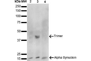- Expressed principally in brain but is also expressed in low concentrations in all tissues examined except in liver. Concentrated in presynaptic nerve terminals.,Binds within the 101-130 aa of human ASYN, determined using DB and ELISA with corresponding peptides. Detects ~14 kDa band corr to ASYN. ~40 kDa is a trimer. Does not detect truncated ASYN (aa 1-114)